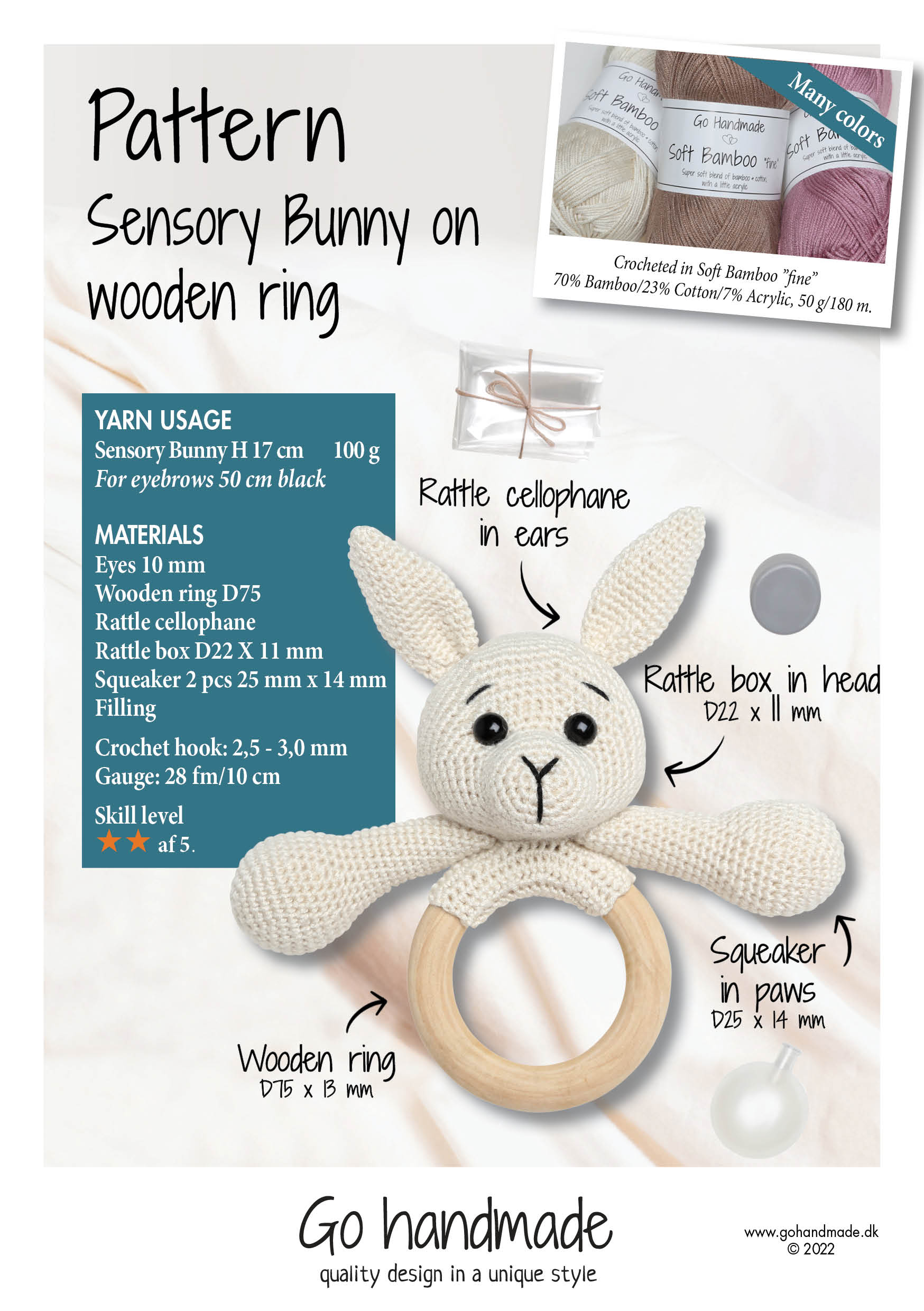 MATERIALS Eyes 10 mm Wooden ring D75 Rattle cellophane Rattle box D22 X 11 mm Squeaker 2 pcs 25 mm x 14 mm Filling